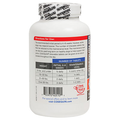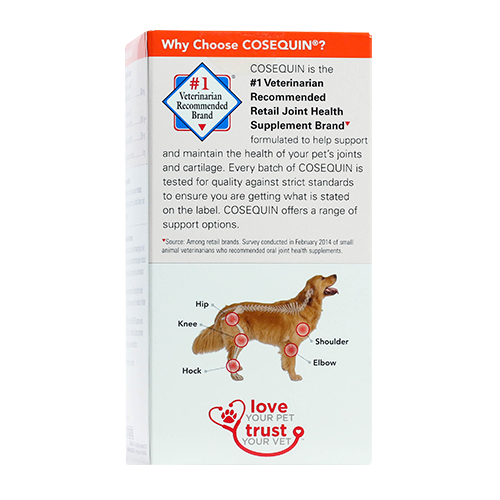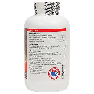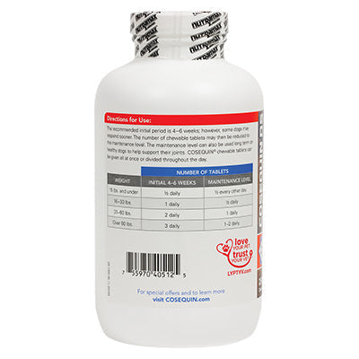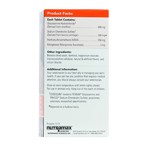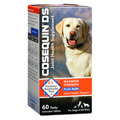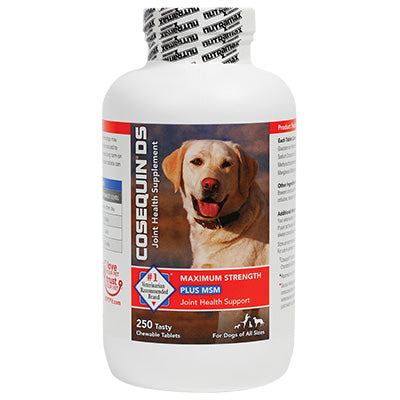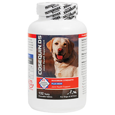 Cosequin DS Maximum Strength Plus MSM contains FCHG49® Glucosamine Hydrochloride†, TRH122® Sodium Chondroitin Sulfate†, and MSM (Methylsulfonylmethane). This combination of ingredients helps maintain your dog's cartilage and connective tissue. Cosequin DS Maximum Strength Plus MSM comes in bottles of 60, 132, 180, and 250 tasty chewable tablets. Use Cosequin to support mobility for a healthy lifestyle in your pet!